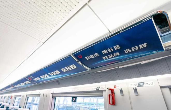 陽谷日輝電纜將品牌與產(chǎn)品元素融入列車的各個環(huán)節(jié),通過車身彩貼、語音播報、海報、行李架天幕、頭枕片等宣傳區(qū)域,全方位立體展示日輝產(chǎn)品,形成了「日輝電纜」品牌"移動走廊”。